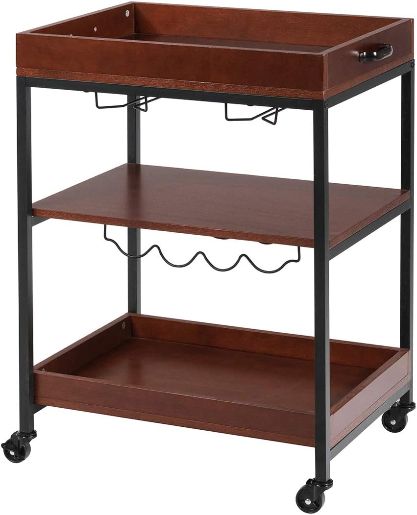 Description:Our industrial kitchen cart brings you convenient life experience!Made of high-quality wood board and sturdy metal frame, the cart is extremely durable with greater bearing capacity. The three-tier structure provides a lot of storage space, and you can place items layer by layer according to your needs. With two-row wine cup holder and single-deck wine rack, the cart makes kitchen more organized. Equipped with 4 rolling casters, it’s easy to move in the kitchen. It is ideal for kitchen, bars, restaurants and more.Features:Made of high-quality wood board and metal frame to ensure stability and durability3 shelves provide ample storage spaceWine racks and glass holders for hanging wine bottles and cups respectivelyEasy to move with four flexible swivel wheelsTwo lockable casters provide stability when stoppingSimple industrial design integrated perfectly with most home decoration stylesSuitable for kitchens, apartments, hallways, restaurants, etcEasy to assemble and easy to cleanSpecifications:Color: BrownMaterial: P2 Particle board + IronProduct Dimension: 24” x 18” x 33.5” (L x W x H)Total Weight Capacity: 44 lbsWeight Capacity of Top Shelf: 22 lbsWeight Capacity of Next Two Shelf: 11 lbs eachNet Weight: 33 lbsPackage includes:1 x Kitchen Trolley Cart1 x Instruction