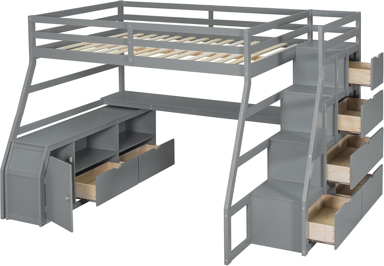 Full Size Loft Bed with Desk and 7 Drawers, Wooden Loft Bed with Storage Stairs and Shelves, Loft Bed Frame for Kids & TeensIt's time for your growing little sprout to graduate to their very first big bed, and not just any bed will do for that whimsical bedroom design you have in mind. It provide a perfect sleep area while also have an extra area hang your toys & set books. This open concept allows for creativity to decorate with any special piece of art, or makes a statement without hiding existing decor. Featuring a loft bed appearance, the bed adds extra fun, the bed can be decorated as your personal private space. Specifications:Product Type: Loft Bed Size: Full Color: White/Espresso/Grey Material: Plywood+MDF+Pinewood Place of Origin: Vietnam Spring Box: No Need Mattress Included: No Assembly Required: Yes Additional Tools Required: All Tools Included Weight & Dimensions:Product Dimension: 94.7"L x 72.7"W x 68.3"H Product Weight: 319.75 LBS Weight Capacity: 220 LBS Recommended Mattress Thickness: 4-6" Number of Slats: 14 pcs Package Number: 3 Kindly Notes:Manual measurement has been used, there may be some reasonable error. All the pictures are taken by actual samples, slight chromatic aberration may occur due to lighting or display.