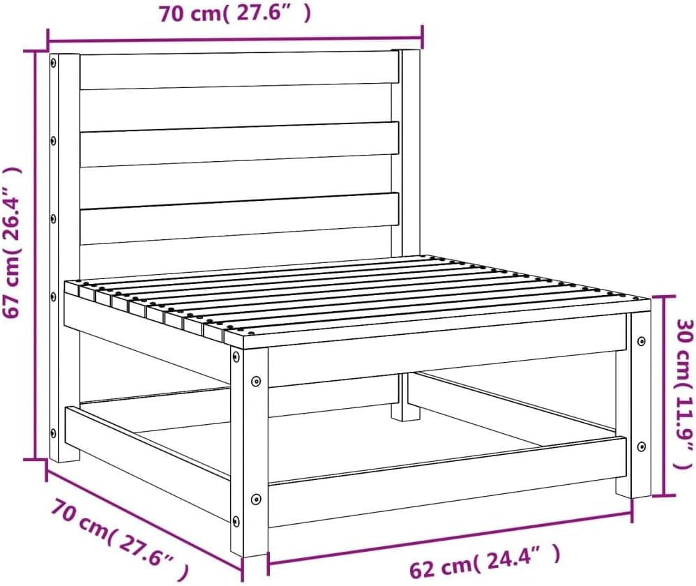 These wooden garden sofas will make a great addition to your garden, terrace, or patio for chatting with family and friends or just enjoying the weather. Solid pine wood: Solid pine wood is a beautiful natural material. Pine wood has a straight grain, and the knots give the material its signature, rustic look. Made of solid pinewood, this armless sofa is durable and stable.Comfortable seat experience: The backrest adds extra seating comfort for the garden sofa chair.Slatted design: The slatted design of the outdoor sofa effectively prevents water from pooling, ensuring that the seat remains dry and free from potential rot.Modular design: This single sofa features a modular design, making it completely flexible and easy to move around to suit any setting. You can combine it with other modular segments available in the drop-down menu to create your own personal garden lounge set configurations! Good to know:To make sure your outdoor furniture stays beautiful, we recommend protecting it with a waterproof cover.Material: Solid pine wood (untreated)Dimensions: 27.6" x 27.6" x 26.4" (W x D x H)