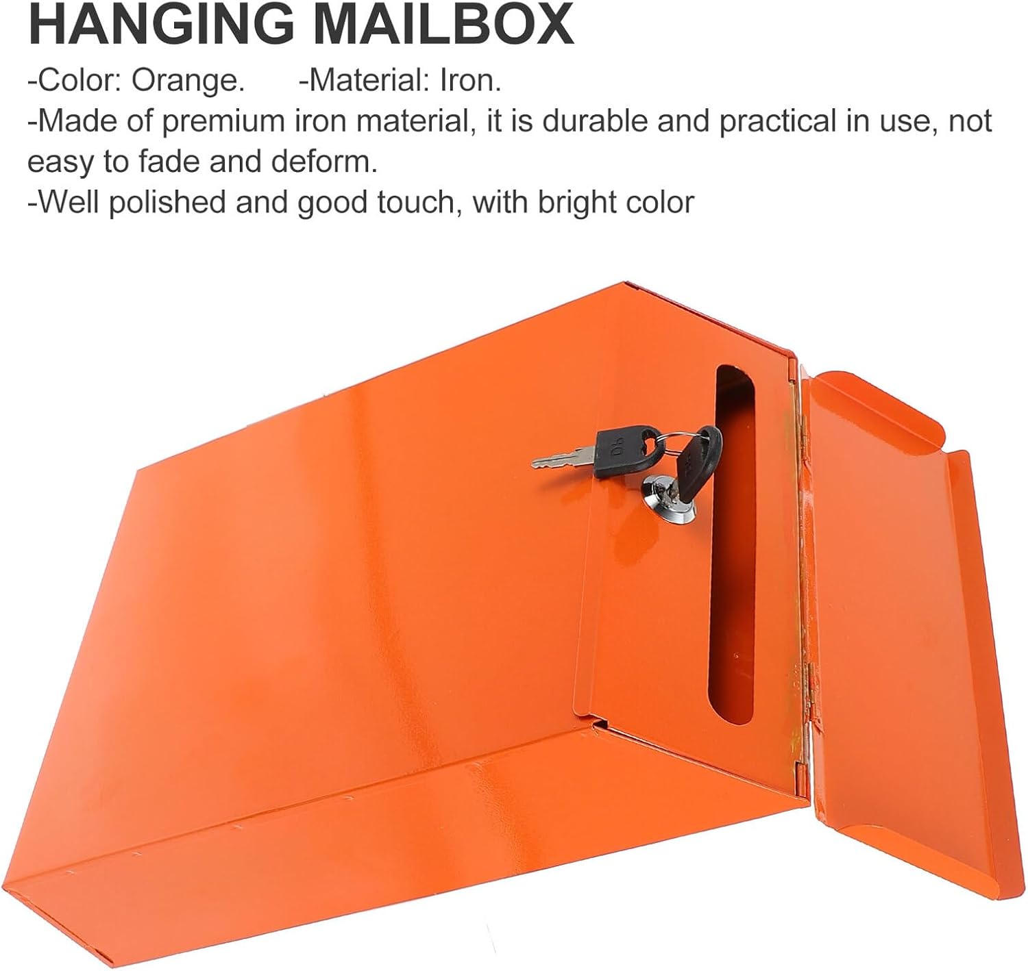 Package List 1 x mailbox 2 x keys 3 x non-trace nails Features -Product Info:Wall mailbox -Material: Iron. -Size: About 30.00X22.50X6.50cm/11.79X8.84X2.55inch. -Color: Orange. -With wall-mounted post , it can be an ornament for home background wall wall mounted mailboxes. -Can be used as a mailbox, suggestion letter box, complaint letter box and more decorative mailboxes for outside. -Not only a wall mailbox, but can also be used as photo prop and stage prop vintage mailbox wall mount. -European style design makes it more unique and stylish, not easy to stain mailboxes. -The post box is durable with looking, with key and lock, can ensure safety mailboxes for outside.Goods Informationwall mounted mailboxes Blank mailbox design, convenient for you to painting or writing unique patterns.wall-mount mailbox With wide applicable occasions, great for interoffice mailbox, complaint letter, suggestions letter and more.mailbox for outside This product is a letter box with unique design.retro mailbox that can ensure its durability and practicability